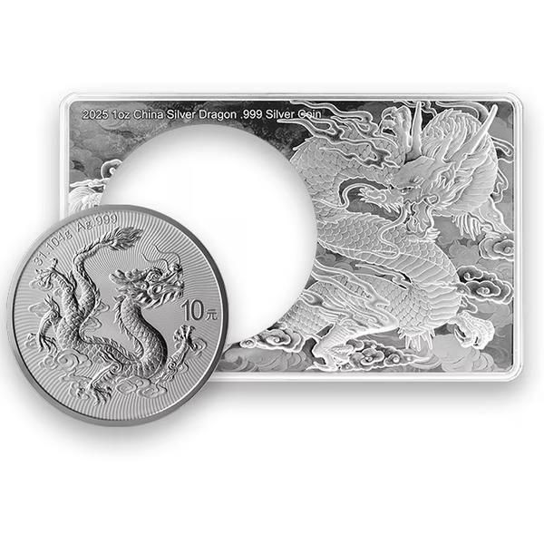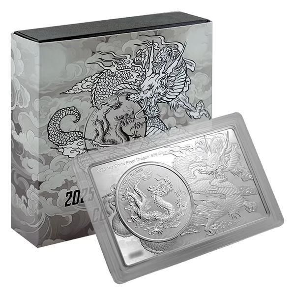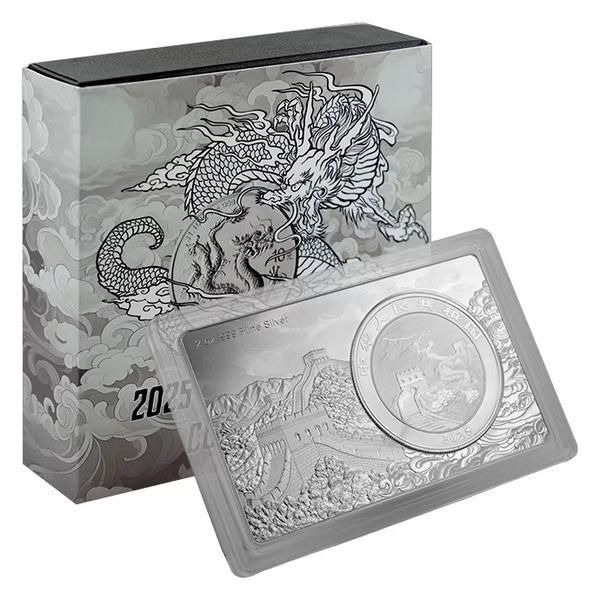 デザインは、優雅さと威厳を漂わせる精巧に描かれた龍の動きを特徴とし、長方形のレイアウトが視覚的なインパクトを高めています。2025年発行のこのバー形式のコインは、現代中国造幣局の芸術性と職人技を際立たせながら、確かな銀純度を誇ります。限定生産のため、他にはない銀貨を求めるコレクターや投資家にとって、いつまでも魅力的なコインとなるでしょう。