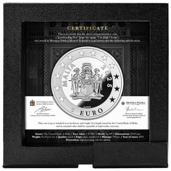 2025 1oz Malta City Hall Clocks - London 5 EURO, with UV-printing