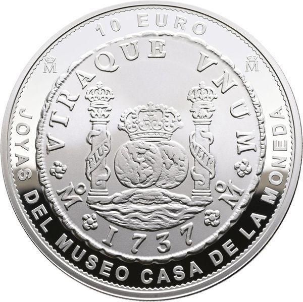 Ãæ±û¤Î¥â¥Á¡¼¥Õ¤Î¼þ¤ê¤Ë¤Ï¡¢Îò»ËŪ¤ÊÌÃʸ¡ÖVTRAQUE VNUM¡×¡¢¥ß¥ó¥È¥Þ¡¼¥¯¡ÖMo¡×¡¢1737ǯ¤ÎÆüÉÕ¡¢¤½¤·¤Æ²Ö¾þ¤ê¤¬»Ü¤µ¤ì¡¢¤¤¤º¤ì¤â¥ª¥ê¥¸¥Ê¥ë¤Î¥¹¥Ú¥¤¥ó¡¦¥É¥ë¤ËÉÁ¤«¤ì¤¿Åö»þ¤Î»Ñ¤òÃé¼Â¤ËºÆ¸½¤·¤Æ¤¤¤Þ¤¹¡£¸½ÂåŪ¤ÊÌÃʸ¡ÖJOYAS DEL MUSEO CASA DE LA MONEDA¡×¤¬¥Ç¥¶¥¤¥ó¤ò±ï¼è¤ê¡¢³ÛÌ̲Á³Ê¡Ö10 EURO¡×¤¬Åº¤¨¤é¤ì¤Æ¤¤¤Þ¤¹¡£